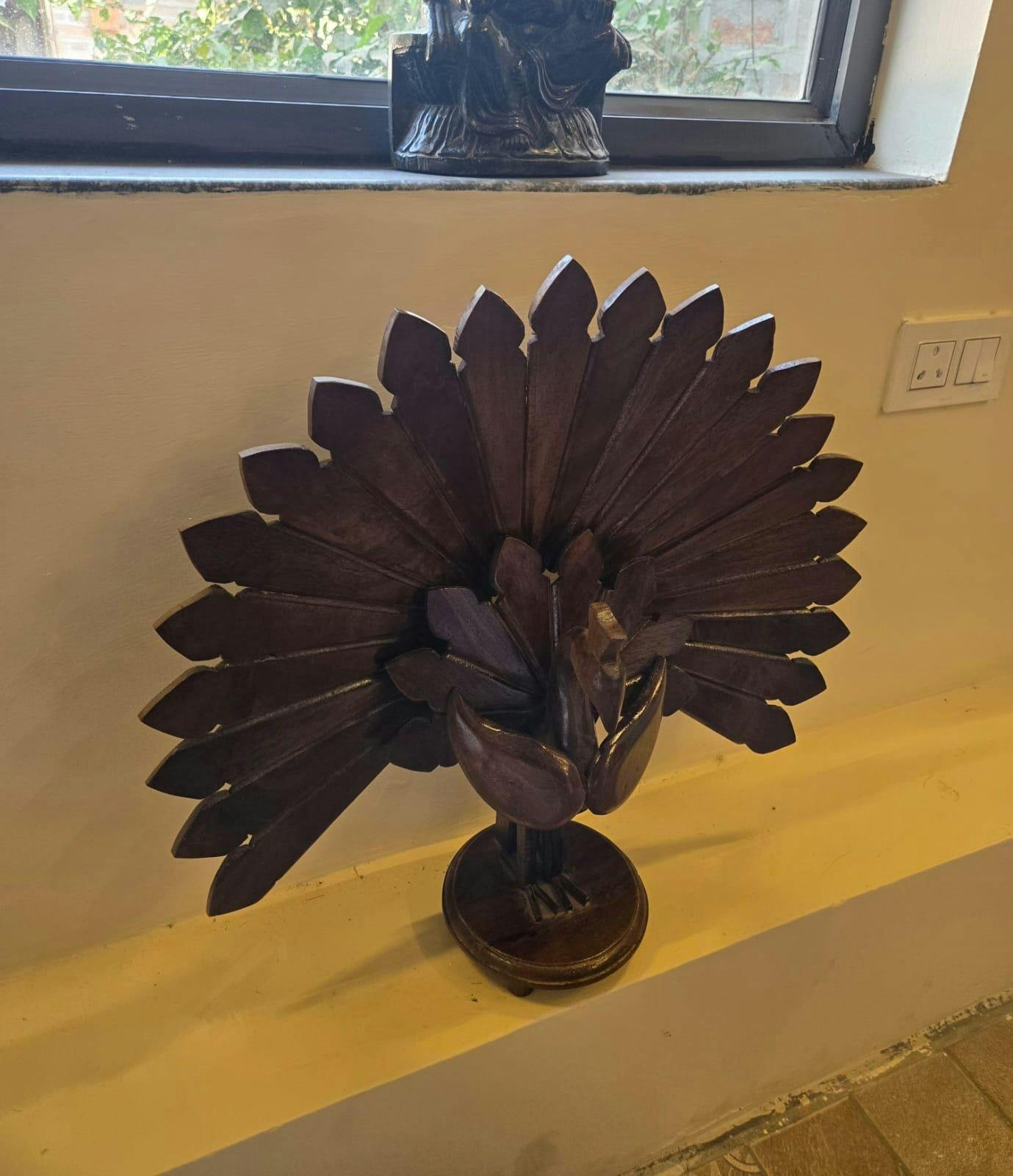 A handcrafted wooden peacock made from carefully assembled wooden pieces, featuring a beautifully fanned tail and a rich natural finish. A striking statement décor piece for any space.